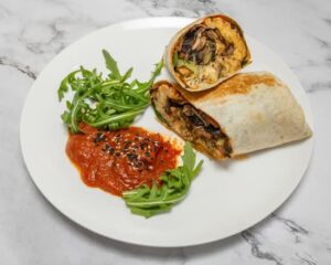| Toasted tortilla with scrambled whole eggs, mushroom, spinach, avocado & homemade relish (v)