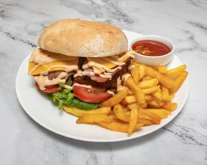 | With double cheddar, caramelised onion, double grilled bacon, tomato, homemade relish & green salad | |