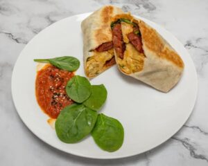 | Toasted tortilla with cheese kransky, scrambled whole eggs, spinach, cheese & homemade relish | |